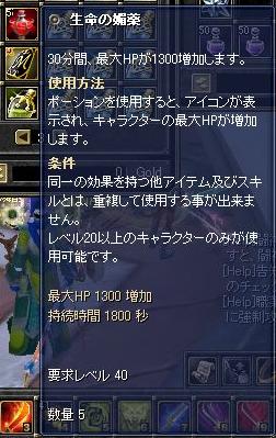 生命の媚薬はレベル制限あり?はっきりと「レベル20以上のキャラが使用可能」とあるのに、要求レベル40とあるのは笑えます。実際どっちなのだろう。こちらももったいなくて使えません。