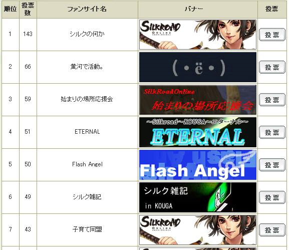 シルクロードオンラインの各種情報と 黄河でプレイする儒炎のブログです。 公式HPにて投票受付中!! 1日1回できます皆さんヨロシク~